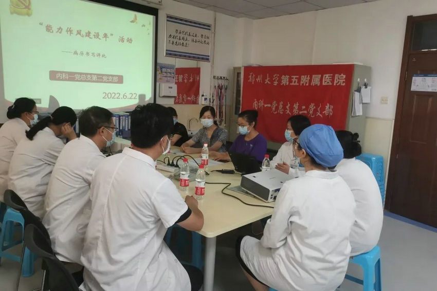 为深入落实医院党委关于“能力作风建设年”活动安排部署,积极响应” 大学习、大培训、大练兵、大提升”号召,郑州大学五附院内科一党总支第二党支部在支部书记马颖光组织下,围绕“提升能力、转变作风”的主题,立足医院三甲复审工作内容及实际,于2022年6月22日举办临床一线科室现运行病历质控评比活动。此次活动特邀机关党总支书记、党委办公室副主任刘燚涛、内科一党总支书记张丽莎现场指导。