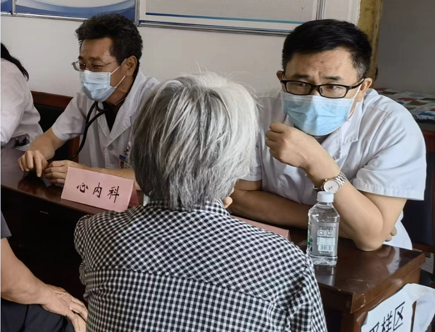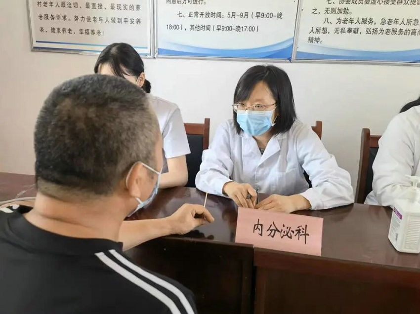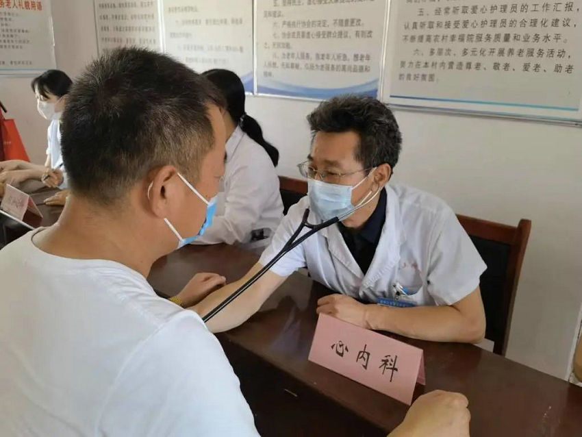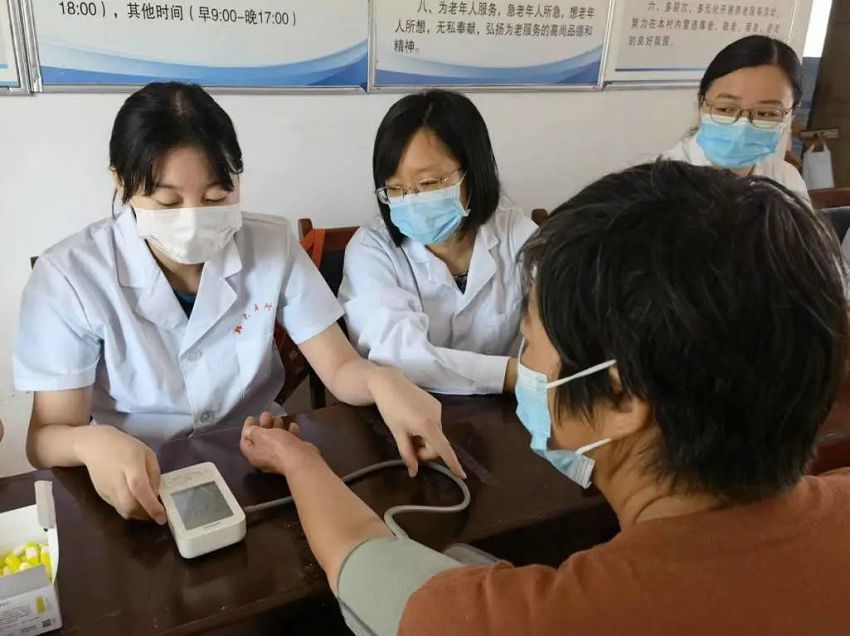 ▲ 医疗队专家为村民们进行血压、血糖检测等健康体检,提供健康咨询服务