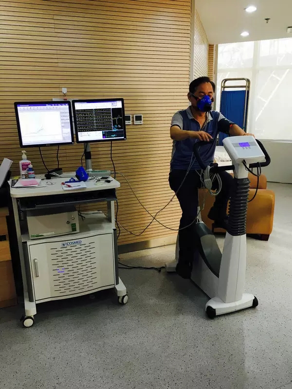 心肺康复可使突发危险的机率降低30%左右。但康复运动强度较小达不到康复的效果;运动强度过大,加重心脏负担,心率加快,血压升高,反而有害于身体。因此对患者进行心功能的评价(评估)至关重要。这就需要通过我院新引进的现代化仪器心肺运动试验设备进行评价,评估心、肺功能,测定最大摄氧量、无氧域等很多指标和评估量表,量身定制,为制定个体化、科学的运动处方提供依据。