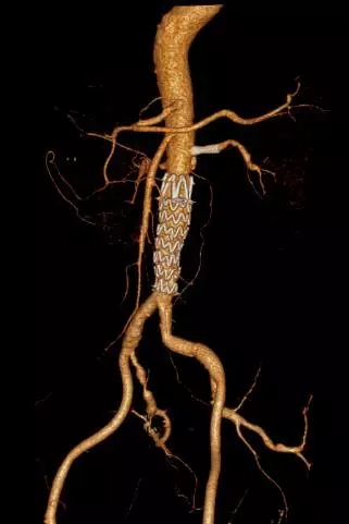 诊断明确后,王兵教授凭借丰富的临床经验,很快就确定了手术方案。考虑患者高龄,传统开放手术创伤大,恢复慢,手术风险巨大,早已不作为首选治疗方案。微创的腔内治疗,通过股动脉小切口,输入主动脉覆膜支架,可以起到封堵动脉破口的良好效果,并且可同期处理肾动脉狭窄,手术创伤小,恢复快,围手术期严重并发症低,目前已是主动脉夹层的首选方案。