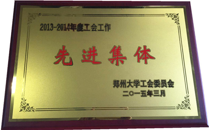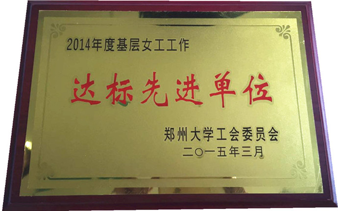 我院女工工作2014年度通过量化考核,荣获校级女工工作“达标先进单位”荣誉称号。我院原工会主席陈琳荣获郑州大学2014年度“女工工作先进个人”。金鹏同志荣获郑州大学“五好文明家庭”荣誉称号,陈炅、马颖光同志荣获“五好文明家庭”提名奖荣誉称号。