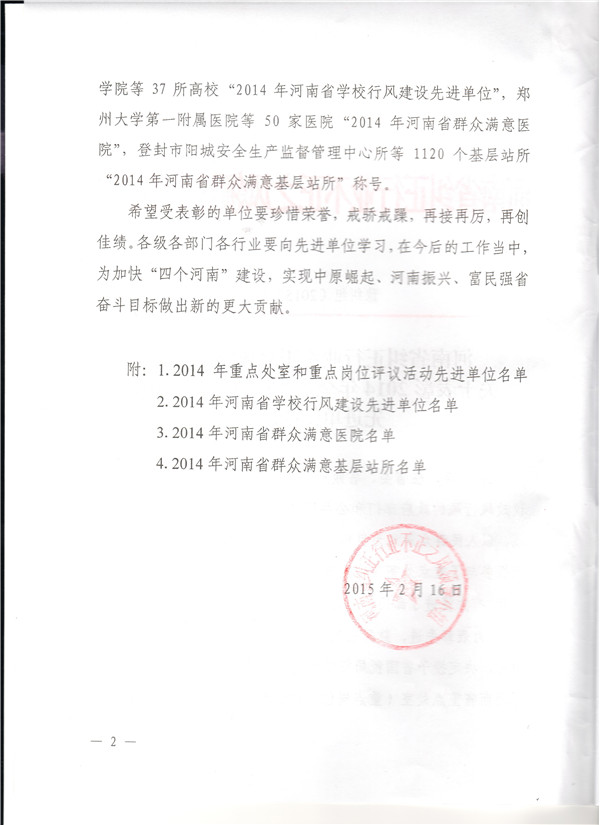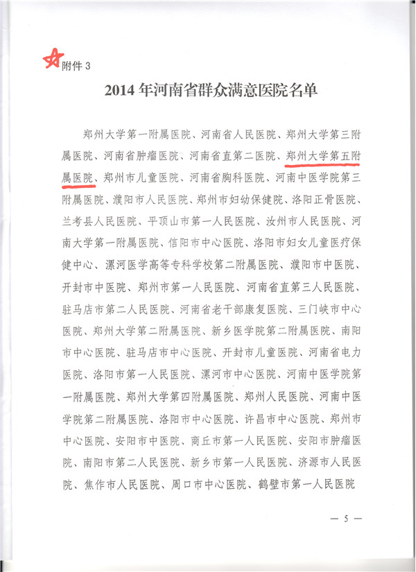 2014年,在省卫计委对全省三级医院、省直医院、省直管县市医院等108所医院行风和卫生纠风专项治理工作的检查评议中,郑州大学第五附属医院获得第六名的优异成绩,并荣膺2014年“河南省群众满意医院”称号,这是继2013年之后,医院连续两年荣获该称号。