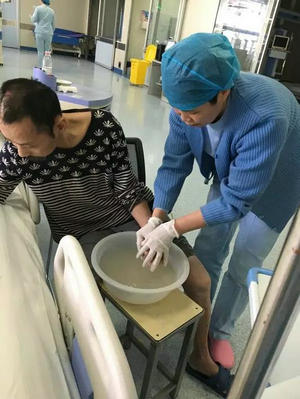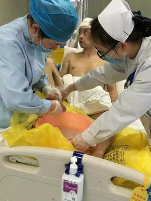 按照科室规定,每天下午4点是探视时间,家属借此机会给自己的亲人擦拭身子、洗脚等。这些简单的动作患者每天都看在眼里,但作为一个“三无”人员,内心肯定不是滋味。细心的护士长苏小霞看到此种情况后,及时给予心理疏导,为打消患者的顾虑,安排重症医学科的医护人员承担起了患者的全部生活护理。