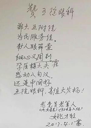 在郑州大学五附院眼科门诊部,一位年逾八旬的老党员、老军人姚大爷激动地写下了这样的话语。