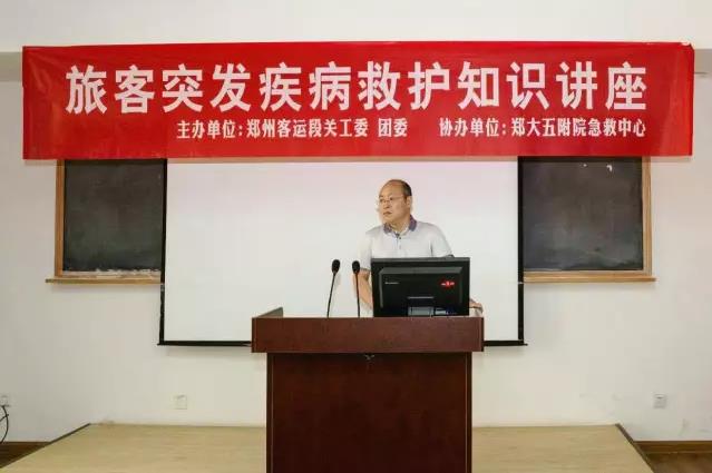 为助力打造 “一带一路”铁路安全线,更好的为旅客安全做好服务,提高对旅客突发事件的应急反应能力。5月23日下午,应郑州铁路局客运段邀请,郑州大学五附院志愿者服务队急诊科陈炅主任、沈岚护师一行四人到郑州铁路局客运段,为广大一线铁路职工进行了一场“旅客突发疾病救护知识讲座”。