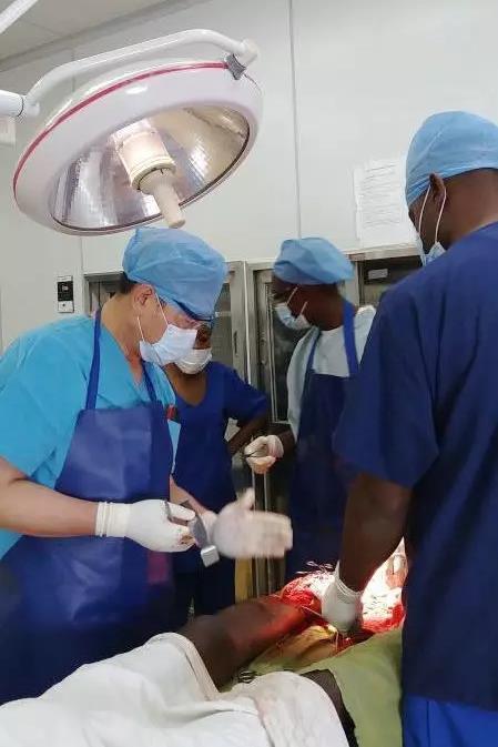 王玉州医生同样工作于利维·姆瓦纳瓦萨医院,一年来共诊治门诊病人2400余人,查房病人600余人,手术病人320余人,救治华人华侨110余人,带教学生26人,外出义诊10次。作为骨科大夫,做手术是家常便饭,但赞比亚的艾滋病病毒携带率非常高,而且手术前未经病人同意不能做艾滋病相关检查,手术台上,一旦被血或分泌物溅到脸上、身上,将会有极大的感染风险!所以每次上手术台前,他都穿上皮围裙、防针刺拖鞋,带上防护眼镜,常常是几台手术下来,浑身湿淋淋。即便如此注意,也免不了意外发生。在一次急救手术中,他被针刺破了手指,但为了不影响救治病人,他只进行了简单的消毒,就又投入到了下一场手术中。这需要多么强大的心理承受能力和多么优秀的职业素养,才能让他在如此惊险的突发状况下表现出这样的大无畏精神!