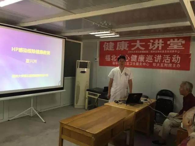 为进一步提升社区居民健康意识、关爱居民健康生活,践行爱国卫生理念的宗旨,提高和增强广大居民的健康观念和防病意识,福华北街社区卫生服务中心一直响应国家号召,在社区中心主任程智和护士长牛光旭的安排下,每个月邀请郑州大学五附院名医专家进社区,为辖区的老百姓举办健康知识讲座。本月特别邀请郑州大学五附院消化内科夏兴洲主任为辖区居民开展“幽门螺杆菌感染根除健康教育”和“脂肪肝健康教育”为主题的相关健康教育知识讲座,受到辖区居民热烈欢迎。