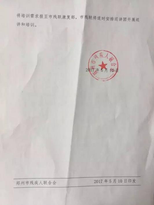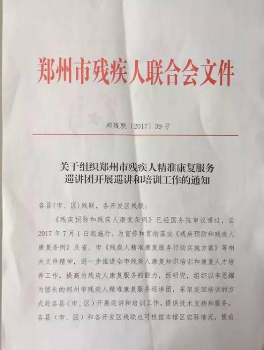 近日,郑州市残疾人联合会发出郑残联【2017】39号文件《关于组织郑州市残疾人精准康复服务巡讲团开展巡讲及培训工作的通知》。此文件旨在进一步推进全市残疾人康复知识培训和康复人才培养工作,提高为残疾人康复服务的能力。经郑州市残疾人联合会研究,组织以郑州大学五附院儿童康复医学科主任、郑州大学康复医院副院长李恩耀为团长的郑州市残疾人精准康复服务巡讲团,采取巡回培训的方式赴各县(市、区)开展巡讲和培训工作,提供技术支持和服务。