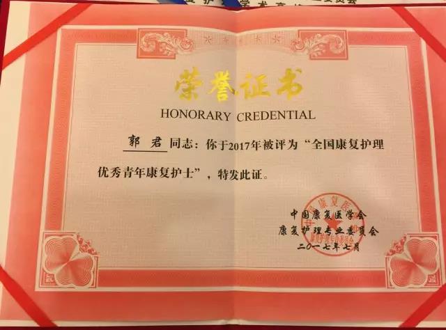 2017年7月17日,中国康复医学会康复护理专委会康复护理学术高峰论坛暨第五届第三次康复护理专业委员会工作会议在南宁闭幕。在会上,郭君护士长获得了一项沉甸甸的荣誉“全国康复护理优秀青年康复护士奖”