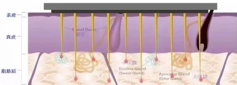 运用黄金包裹的微针矩阵状排列刺入肌肤深层,在针尖处发射射频能量。射频能量在到达真皮的瞬间从黄金微针尖端释放,有效避免了激光在传输过程中的损失和减弱,将能量集中于汗腺组织,提供最精确的治疗。可以安全且有效地破坏大汗腺与小汗腺,持续降低腋下排汗,清除腋下异味。