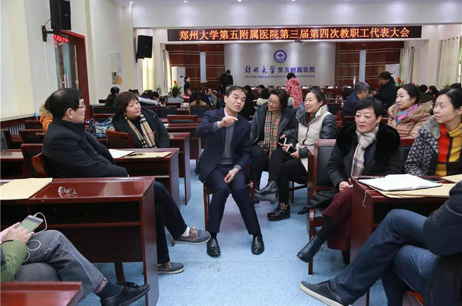 2018年2月1日下午,郑州大学五附院第三届第四次教职工代表大会在门诊五楼会议室胜利召开。会议由院工会主席朱光主持。当天下午在与会代表的共同努力下,大会圆满完成了各项议程,听取审议并通过了4项议题。领导班子成员与教职工代表进行了广泛而深入的讨论,就职工关注的重点工作与热点问题进行了沟通。