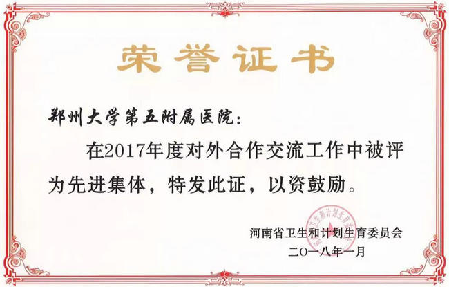 郑州大学五附院被评为2017年度卫生计生对外合作交流工作先进单位