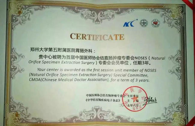 中国NOSES联盟于2017年6月在北京成立。郑州大学五附院胃肠甲状腺外科在结直肠外科胃肠治疗方面所做的工作受到中国医师协会结直肠肿瘤专委会的充分认可,被评为全国为数不多的首届中国医师协会结直肠专委会NOSES专委会会员单位。在结直肠外科微创外科治疗方面,郑州大学五附院胃肠甲状腺外科已经跻身国内先进行列。