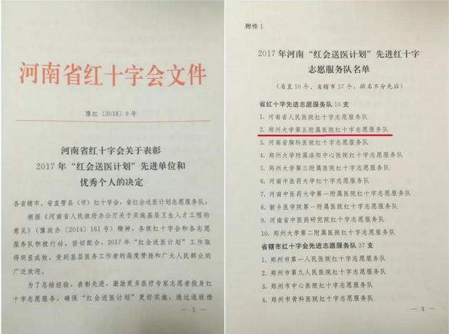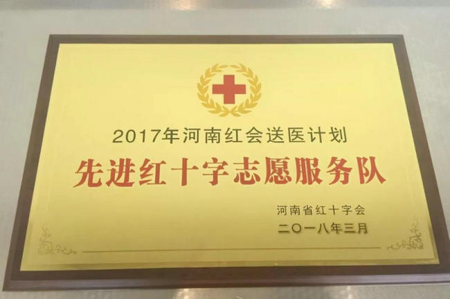 ▲ 郑州大学五附院荣获“2017年河南红会送医计划先进红十字志愿服务队”
