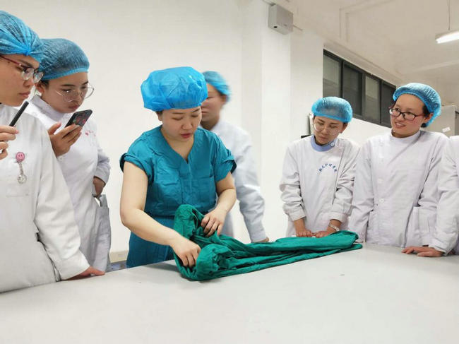 ▲ 手术部主管护师李亚丽为研究生培训“穿无菌手术衣与戴无菌手套”
