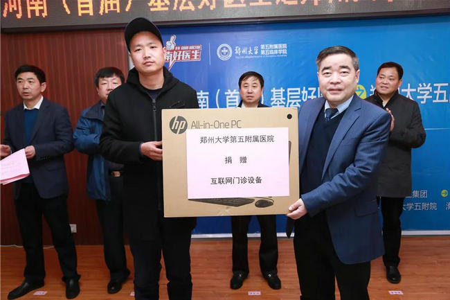 ▲ 仪式上,郑州大学五附院院长郑鹏远向“十佳家庭医生”吴义禄、“最佳医疗服务创新基层医生”王国杰捐赠了“名医通”网络门诊设备。