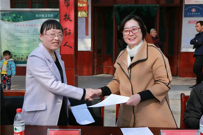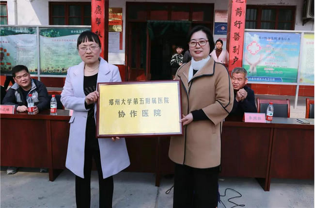 ▲ 党委副书记、纪委书记徐翠英与东小仇卫生院院长席跃华签署合作协议,并向其授予“郑州大学第五附属医院协作医院”牌匾