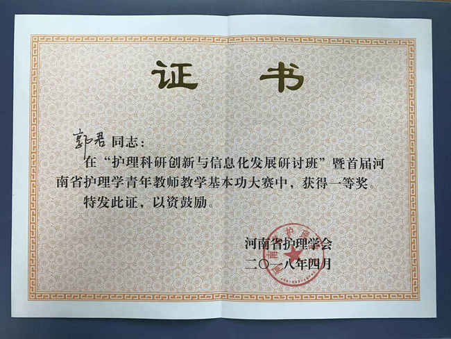 2018年4月26日为加强护理人员的科研创新能力,全面提升青年护理教师的教学基本功,2018年4月26日,由河南省护理学会教育分会主办的首届河南省护理学青年教师教学基本功大赛在嵩山饭店如期举行。来自郑州大学五附院康复医学科的护士长郭君凭借过硬的教学基本功,一路过关斩将,从河南省各高校及各医院的70多名参赛选手中脱颖而出,并在决赛环节的30名选手中力压群雄,一举夺得一等奖,为医院赢得了荣誉,也展示了郑州大学五附院护理教师队伍的风采!