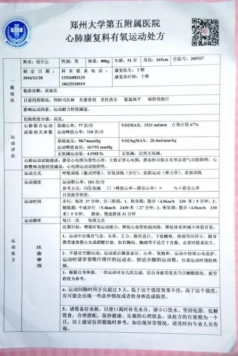 一张运动处方并非一成不变。患者每2个月需要复查一次,医生需要根据患者的情况进行评估调整。“患者长期坚持锻炼,身体机能会提升,在新的运动处方中,可能会给其增加运动量,或调整运动项目,以取得更好效果。”