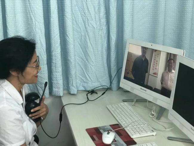 ▲ 中原工学院校长王宗敏通过“名医通”网络问诊系统与郑州大学五附院消化内科三病区主任张淑凤进行交流