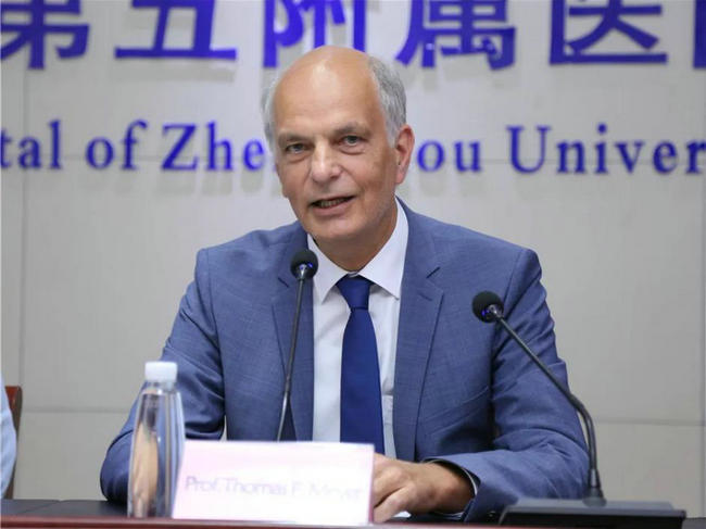 Thomas F. Meyer教授在讲话中感谢能有这次难得的合作机会,借助“幽门螺杆菌与胃癌杰出外籍科学家工作室”的建立,在柏林和郑州这两座城市之间架起医学领域国际合作的桥梁。双方通过在幽门螺杆菌研究技术、人力资源方面的优势互补,加强合作交流,为河南省人民的健康多做贡献!