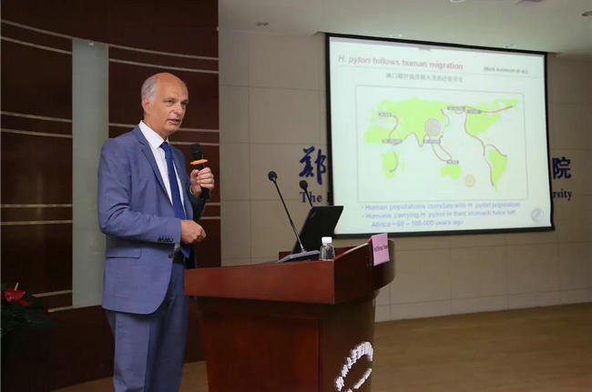▲ 德国科学院院士Thomas F. Meyer教授讲授《幽门螺杆菌的致癌机制研究最新进展》