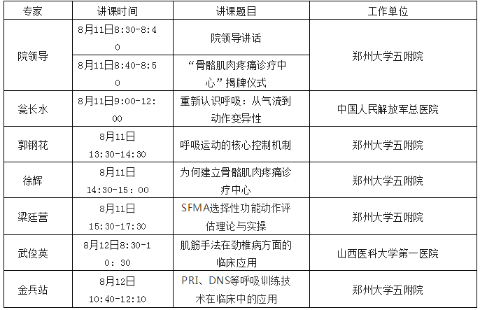郑州大学五附院计划于2018年8月11日至12日在郑州举办“骨骼肌肉疼痛诊疗新技术”沙龙,届时邀请国内多位知名专家做专题讲座。同时,本期学习班学员将现场观摩于8月9日-15日在郑州大学五附院举办的大型义诊活动。