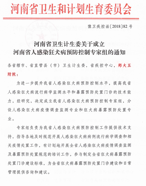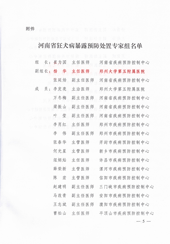 2018年8月9日,河南省卫生计生委下发《关于成立河南省人感染狂犬病预防控制专家组的通知》。通知公布了新成立的“河南省狂犬病暴露预防处置专家组”名单,郑州大学五附院急诊科副主任杨华当选为专家组副组长。