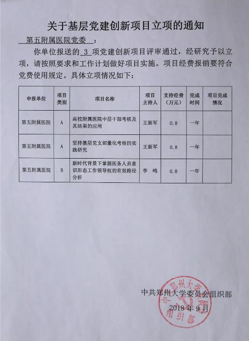 2018年度,王新军作为项目主持人,以《高校附属医院中层干部考核及其结果的应用》和《坚持基层党支部量化考核的实践研究》为题,成功申报了郑州大学党建课题;徐翠英作为项目主持人,以《新形势下高校附属医院廉政风险防控理论与实践研究》为题,成功申报了郑州大学党风廉政建设课题;李鸣和吴彦勇作为项目主持人,以《新时代背景下掌握医务人员意识形态工作领导权的有效路径分析》为题,成功申报了郑州大学党建课题和河南省社科联课题。