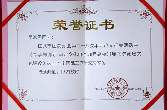 两年来,医院党委成功申报党建课题8项,科研经费将近8万元。党建课题研究取得优异的成绩:王新军、徐翠英撰写的《传承百年历史文化重振三甲医院辉煌》文章,在河南省医院协会医院文化分会、河南省医院自媒体联盟2017年年会上荣获优秀论文一等奖。在郑州大学举办的“讲忠诚 守纪律 做标杆”征文活动中,庄健、徐翠英撰写的《医院纪检监察部分如何履行监督责任理论与实践》荣获一等奖;吴彦勇撰写的《高校附属医院廉政风险防控体系构建的有效路径》荣获二等奖。吴彦勇撰写的《继承与创新:坚定文化自信,加强高校附属医院党建文化建设》文章,在中国卫生思想政治工作促进会城市医院分会第二十八次年会论文征集活动中,以优秀论文收入《医院工作研究文库》。吴彦勇、张丽莎合著的《自媒体(微信)时代下附属医院“微党课”学习探析》文章,在河南省医院协会医院文化分会、河南省医院自媒体联盟2018年年会暨第三届医院文化与自媒体发展高峰论坛上,荣获二等奖。