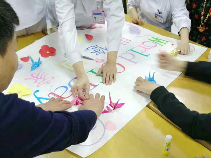 ▲ 第二步,病人在治疗师的帮助下粘贴字母,花朵,千纸鹤等作品,并在展板上画上云朵,气球等自由创作作品