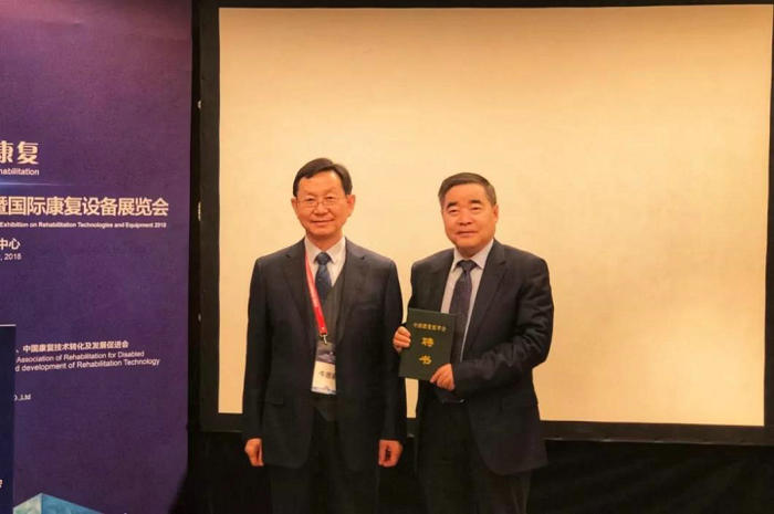 ▲ 中国康复医学会党委书记牛恩喜(左)为郑州大学第五附属医院院长郑鹏远教授颁发消化病康复专委会主任委员聘书