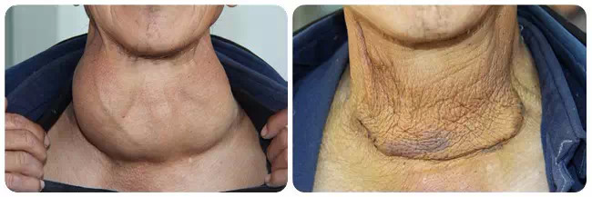 近年来,甲状腺良、恶性肿瘤及结节性甲状腺肿物的发病率逐年增加。随着彩超检查手段的不断完善,甲状腺早期小结节的检出率大大提高,使得患者能在早期得以治疗,像该患者这样如此巨大的结节性甲状腺肿物实属罕见。崔主任提醒:1、坚持自查颈部有无包块和增粗,发现异常时及时做甲状腺彩超;2、一旦发现甲状腺有结节,要定期行彩超检查(3-6个月)并到正规甲状腺专科就诊,听取专业医生的建议和指导;3、早期诊断,早期治疗,避免肿块时间过长出现压迫症状,给手术增加难度危及患者安全。