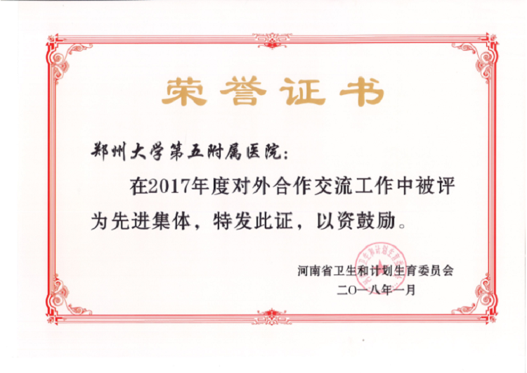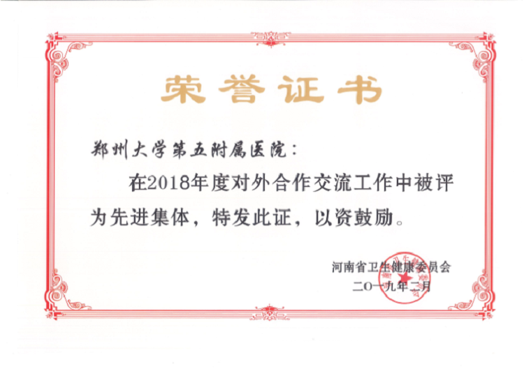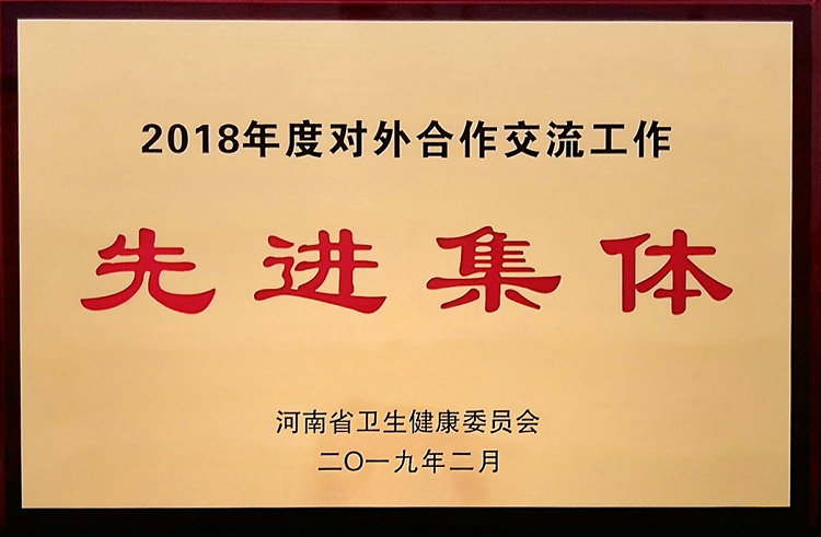 ▲ 郑州大学五附院连续两年荣获对外合作交流工作先进集体