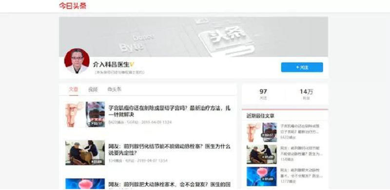 在今日头条上,有一位户名叫做“介入科吕医生”的公众号,每天发布很多介入治疗的动态,其新锐的的理念、先进的治疗技术、图文并茂的科普知识,使其坐拥十五万忠实粉丝,一篇文章曾创下阅读量350多万的记录。