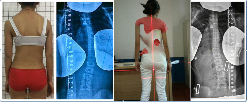 患者2 女 12岁 胸腰 “S”侧弯,其中腰弯33°、胸弯30°矫治前后对比。