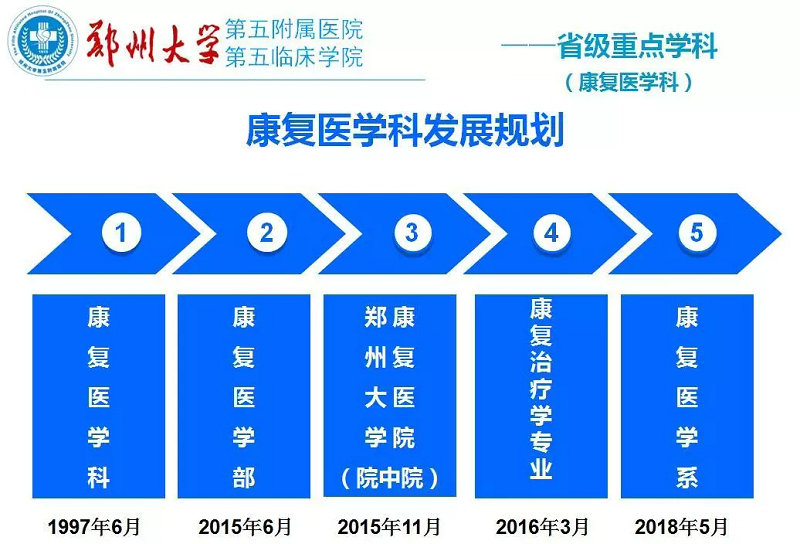 2016年3月,国家教育部批准郑州大学依托郑州大学五附院设置康复治疗学专业,顺利完成2016年、2017年、2018年三届本科招生工作。2018年6月4日,郑州大学下发正式通知文件,在5月26日学校2018年第十二次党委常委会议上研究决定:依托第五临床学院(郑州大学五附院)设立康复医学系,由郑鹏远(郑州大学五附院院长)兼任系主任;康复医学系与学院管理机构并行运行,配置教师编制8-10个。