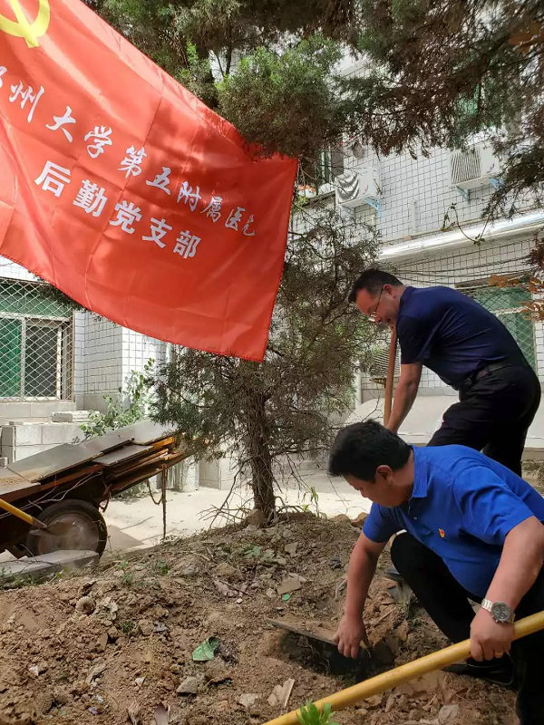 为更好的深入学习领会党的十九大精神,学习践行“绿水青山就是金山银山”新发展理念,改善医院的就医环境,在傅聿铭副院长的安排部署下,后勤党支部书记王栋带领后勤党员同志,于2019年5月23日下午15点,到康复楼后西北角开展党员志愿服务——清理积土碎石,还院区一片绿地。