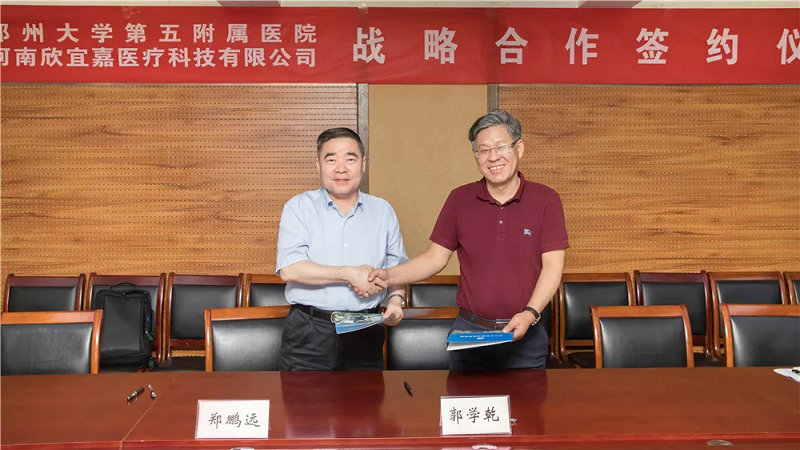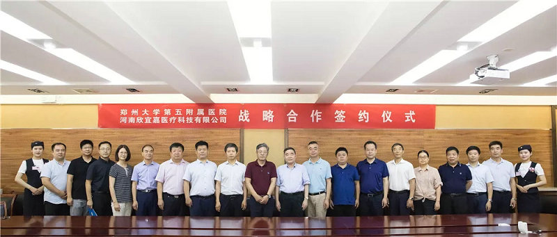 2019年6月18日,郑州大学五附院与河南欣宜嘉医疗科技有限公司在郑签署战略合作框架协议。郑州大学五附院全体领导班子成员,欣宜嘉公司董事长兼总裁郭学乾、副总裁李浩、王建峰,事业部经理刘剑、运营经理杨润声,成都义幻医疗科技有限公司副总裁邵亚均出席签约仪式。
