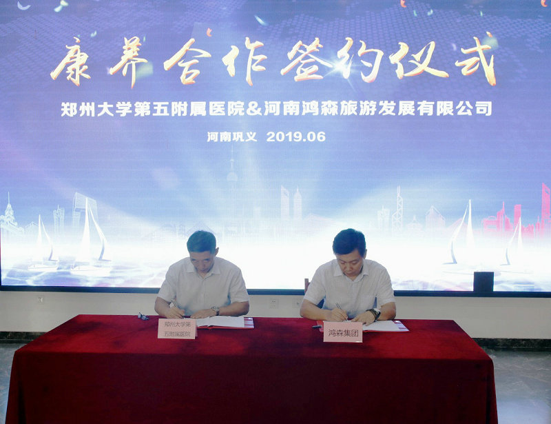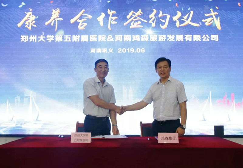 2019年6月27日上午,为推动康养事业的新发展,发挥三甲医疗机构在康养技术方面的龙头作用,拉动社会资本助力健康养老事业,推进医疗卫生与健康养老融合发展,郑州大学五附院副院长王少亭受医院委托,带领相关职能部门负责人到河南鸿森旅游发展有限公司就双方康养项目合作举行了签约仪式。
