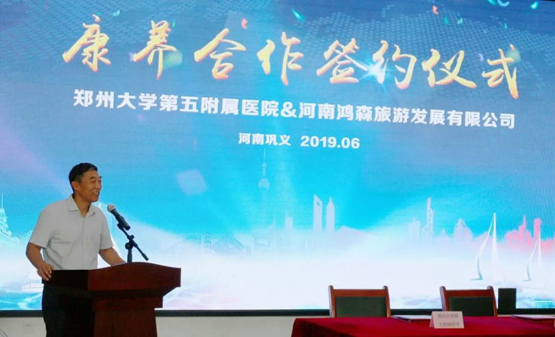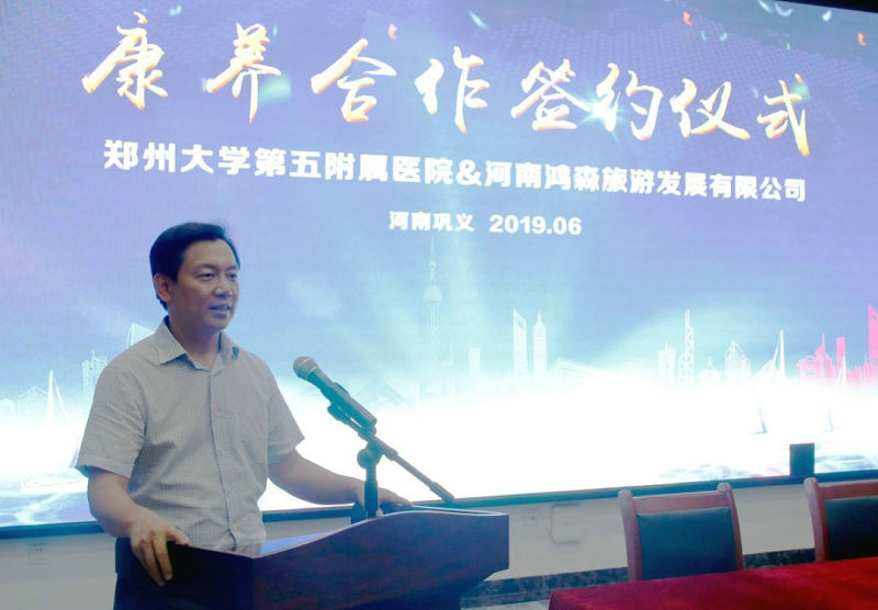 王利军董事长在讲话中表示:郑州大学五附院所拥有的强大的医疗、康复、护理、互联网等综合优质资源令人振奋、让人期许。他介绍了鸿森集团总投资58亿元,围绕文旅、康养、研学三大板块融合发展,构建“一镇、五谷、十园” 规划目标,以及目前在建的九畴府康养社区、河洛文化康养酒店、中医康养街、河洛文化康体公园、中医养生谷、综合研教培训基地等项目情况,表示与郑州大学五附院的签约将促进鸿森集团康养项目的快速健康发展。