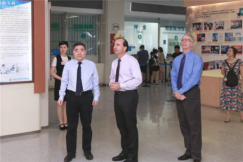 会议结束后,Wesley Milner教授等一行专家在郑鹏远院长的陪同下参观了医院院史馆,通过了解医院发展历史,两位教授对郑州大学五附院近年来的转变与快速发展表示震撼。
