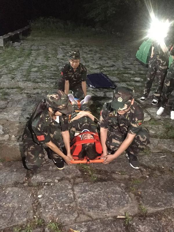 在宿营地搭建完成后,又开展了卫生应急技能的训练与考核,内容包括单人徒手心肺复苏、四肢外伤固定包扎、颈椎外伤固定搬运、气道异物急救等内容,经过积极训练与考核,达到了人人达标的目的,提升了应急队员的野外急救能力。