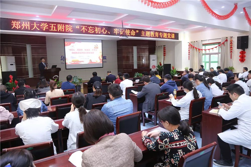 为深入推进“不忘初心、牢记使命”主题教育,落实好主题教育各项工作部署。2019年10月12日下午,郑州大学五附院在门诊五楼会议室举办“不忘初心、牢记使命”主题教育专题党课,党委书记王新军以“守初心、担使命,找差距、抓落实,持续推进五附院高质量发展”为题,结合医院实际,深刻诠释初心使命内涵,激励党员干部把主题教育的成果转化为推动医院高质量发展的实际成效。医院领导、党支部书记、中层干部、护士长、积极分子以及部分学生代表共210多人参加。主题教育专题党课由纪委书记周文平主持。