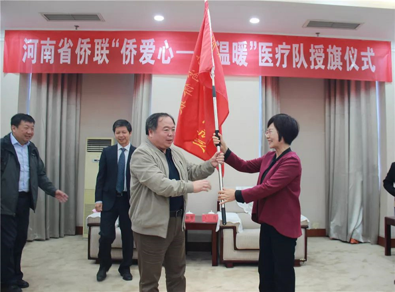 当天上午,郑州大学五附院党委书记王新军、副院长朱光带领由呼吸内科、心血管内科、内分泌科、消化内科、神经内科、骨关节康复科医疗专家及医疗协作办公室负责人和相关工作人员组成的医疗队,参加了河南省侨联举办的“侨爱心—送温暖”医疗队授旗仪式。