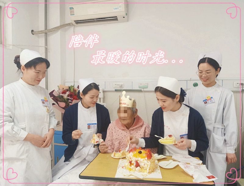 医护人员为董奶奶庆祝生日,董奶奶感受到了家人般的温暖,老人看着身边亲人般的医护人员,吃着喂到嘴边的生日蛋糕,露出了幸福的笑容。