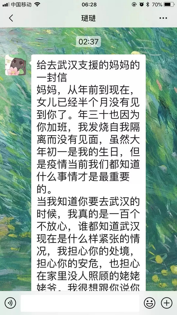 “妈妈,我想告诉你,你放心地去支援武汉吧,我会照顾好自己,你不用担心我,照顾好你自己才是我最想看到的。”