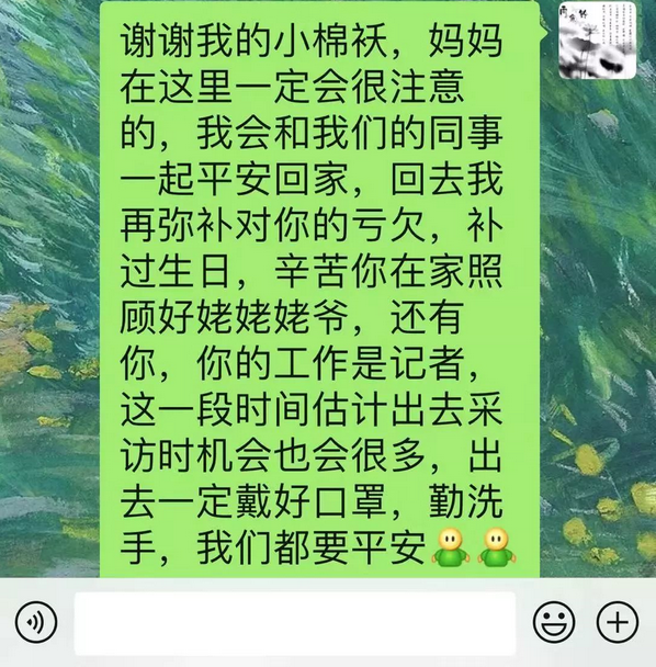 看过女儿的微信,万琳的眼角湿润了。她给女儿回复道:“谢谢我的小棉袄,妈妈在这里一定会很注意的,我会和我们的同事一起平安回家,回去我再弥补对你的亏欠,补过生日。辛苦你在家照顾好姥姥姥爷。还有你,你的工作是记者,这一段时间估计出去采访也会很多,出去一定戴好口罩,勤洗手,我们都要平安。”