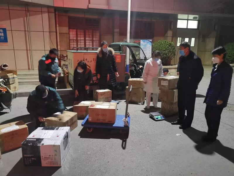 ▲ 1月31日晚,医院副院长王少亭带领护理部负责同志将医院为前线医疗队筹备的补给物资用快递寄出