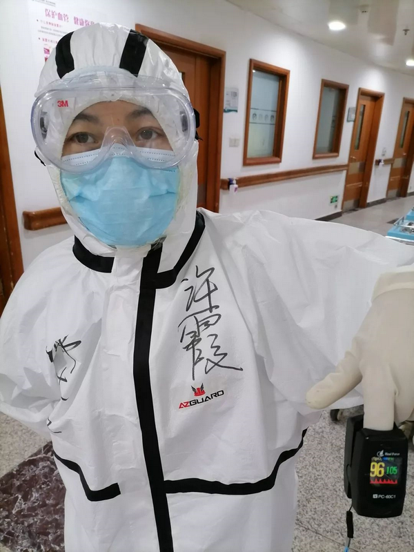 夜间光线本来就暗,护目镜的雾气虽然经过大家处理短期改善,但一两个小时后依然模糊不清。医疗组电话指挥开立医嘱,护理组查对医嘱双人双遍。防护服的密不透风确保了安全,但很多队员的呼吸不畅让他们举步维艰。许霞护师刚刚进病区半小时,心率就达到105次/分钟,李晶护士长用指脉氧饱和度仪给自己测了一下,还好氧饱和度96%,再看看心率达到116次/分钟,她说已经适应了,不耽误任何护理操作。